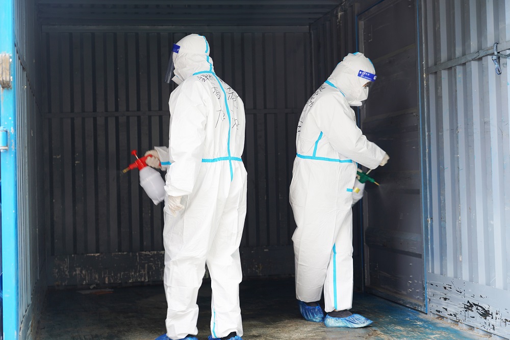 工作人員全副武裝進(jìn)行測(cè)溫、驗(yàn)碼、消毒