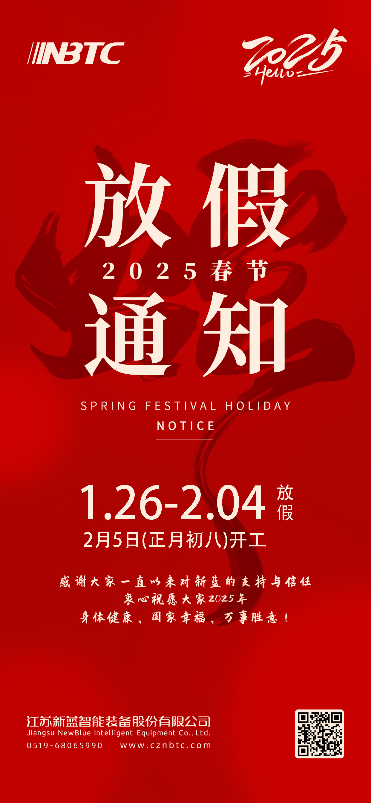 值此新春佳節來臨之際,江蘇新藍智能裝備股份有限公司向一直以來支持信任我們的各界伙伴致以最誠摯的感謝!根據公司安排,2025 年春節放假時間為 1 月 26 日 - 2 月 4 日,2 月 5 日(正月初八)正式開工。在此溫馨提醒大家合理安排假期,放松身心,盡享團圓之樂。新的一年,愿我們攜手共進,再創輝煌!祝大家新春愉快,蛇行大運,闔家幸福,萬事順遂!