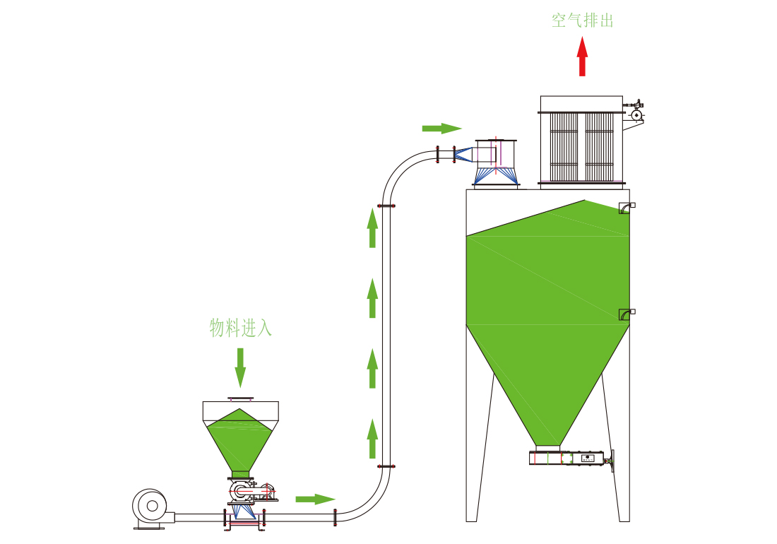 該輸送方式設備簡單,短距離輸送效果顯著,設置分路閥可實現從一處向數處分散物料,位于管路末端的分離器與卸料器簡單。