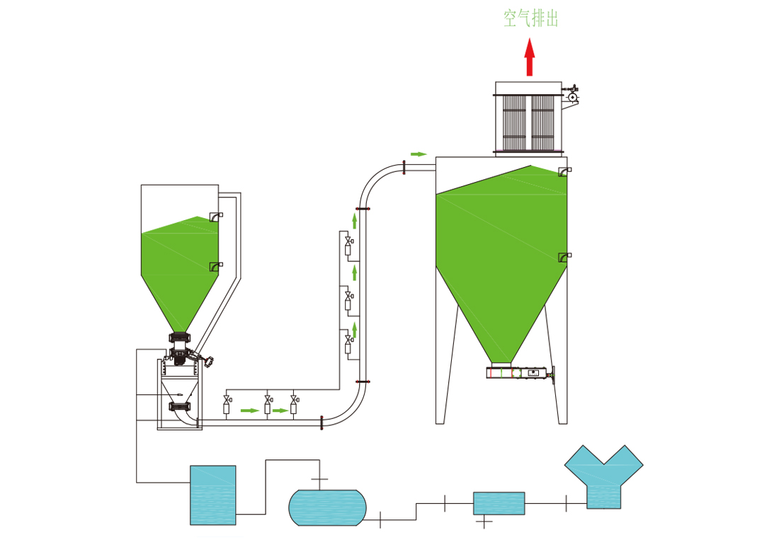 該輸送方式將流態(tài)化的物料作栓流輸送,輸送時速度極低,耗氣量小,能耗小,輸送過程中粒子的破碎小,末端的收塵裝置簡單。